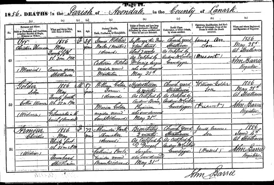 James Golder died before 15 January 1829, the date upon which he was buried at Avondale in Lanarkshire, Scotland. [Avondale Death Records, Transcribed, Edited and Published by the Lanarkshire Family History Society, 2005].